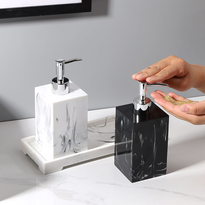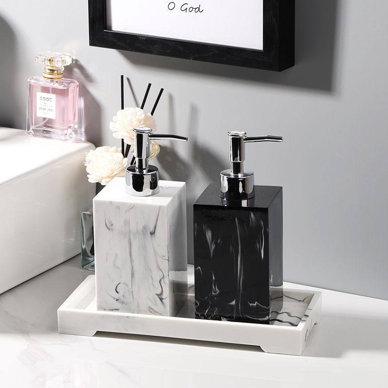 Marble colored bathroom soap dispensers (black, white, plus tray)